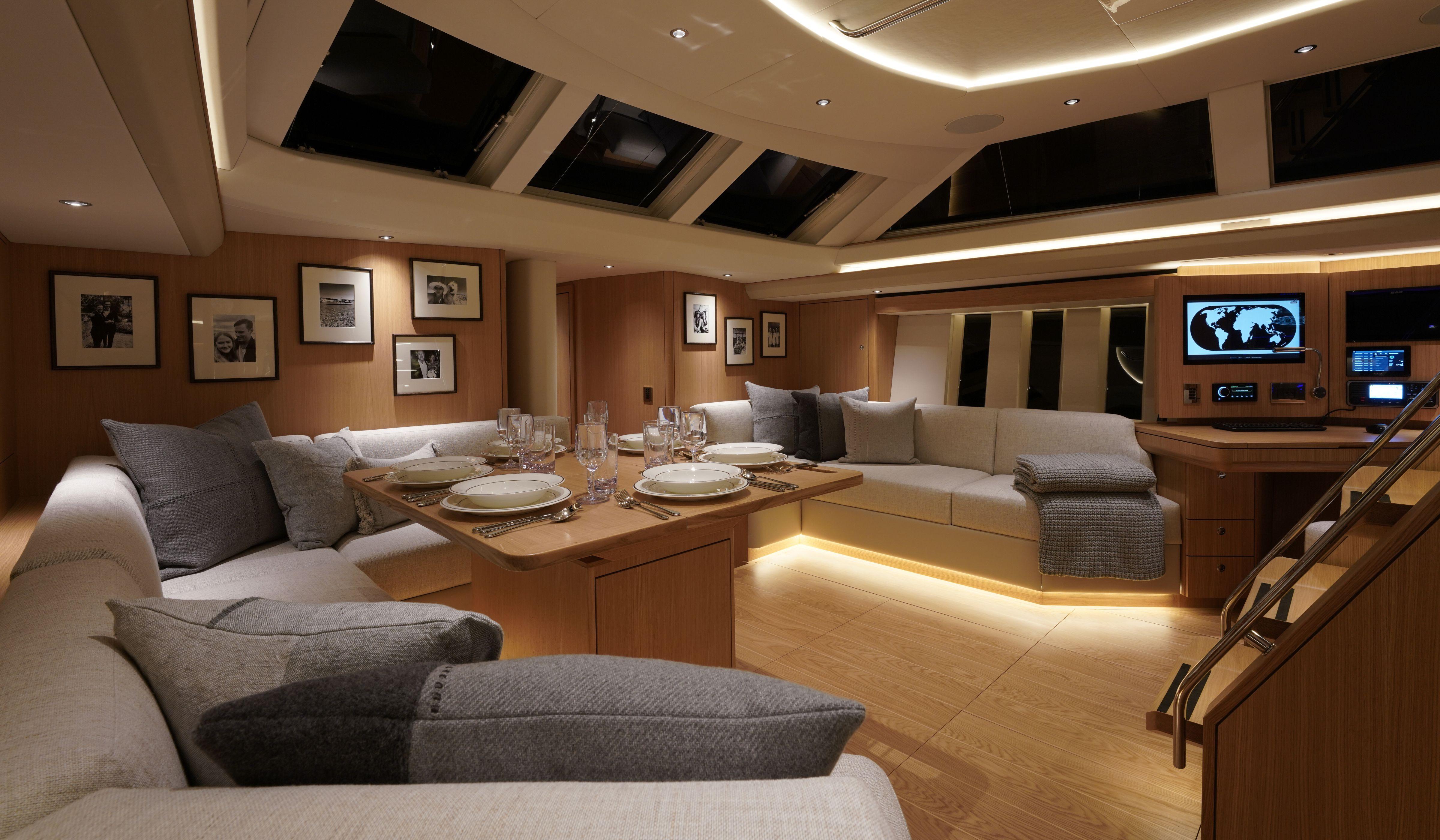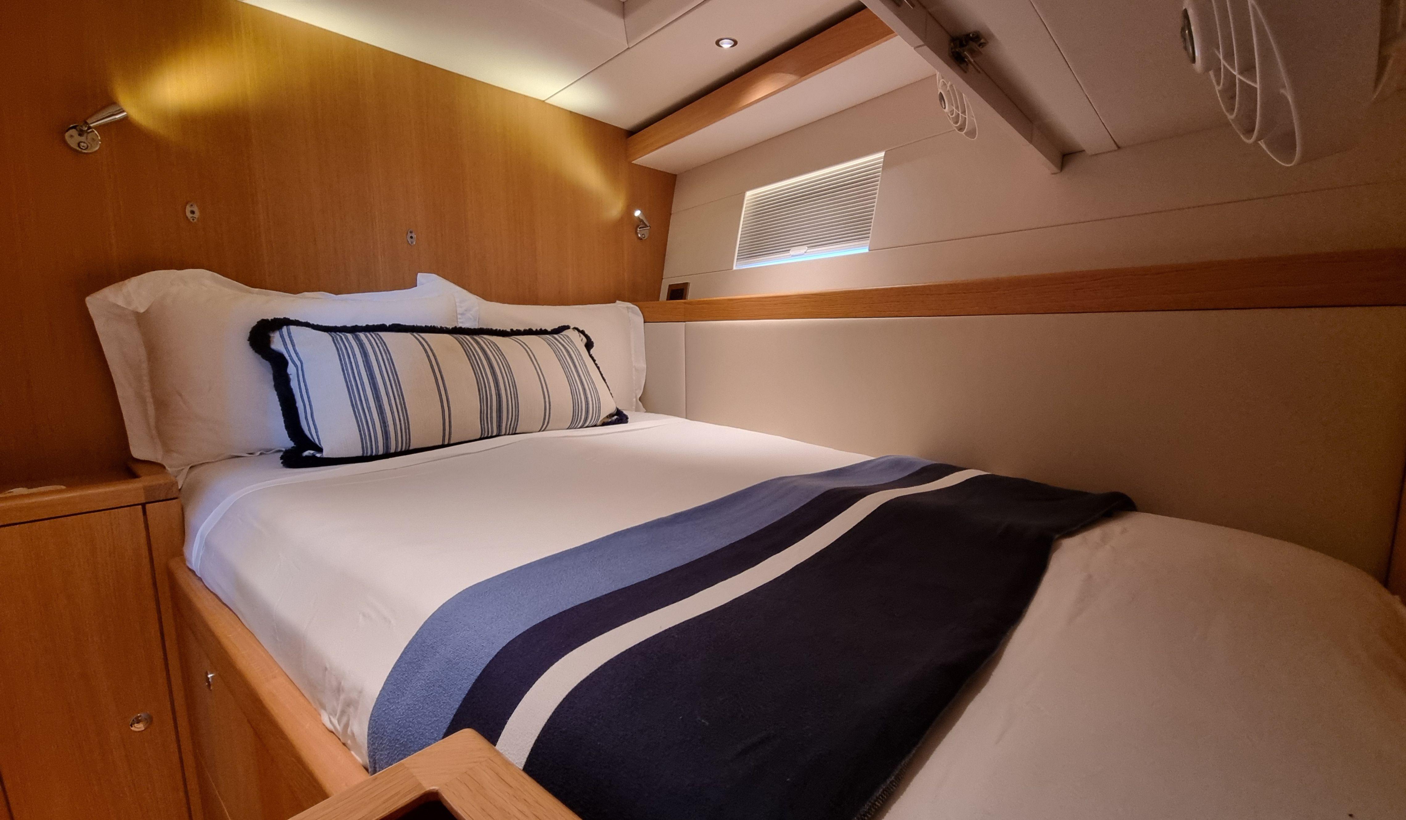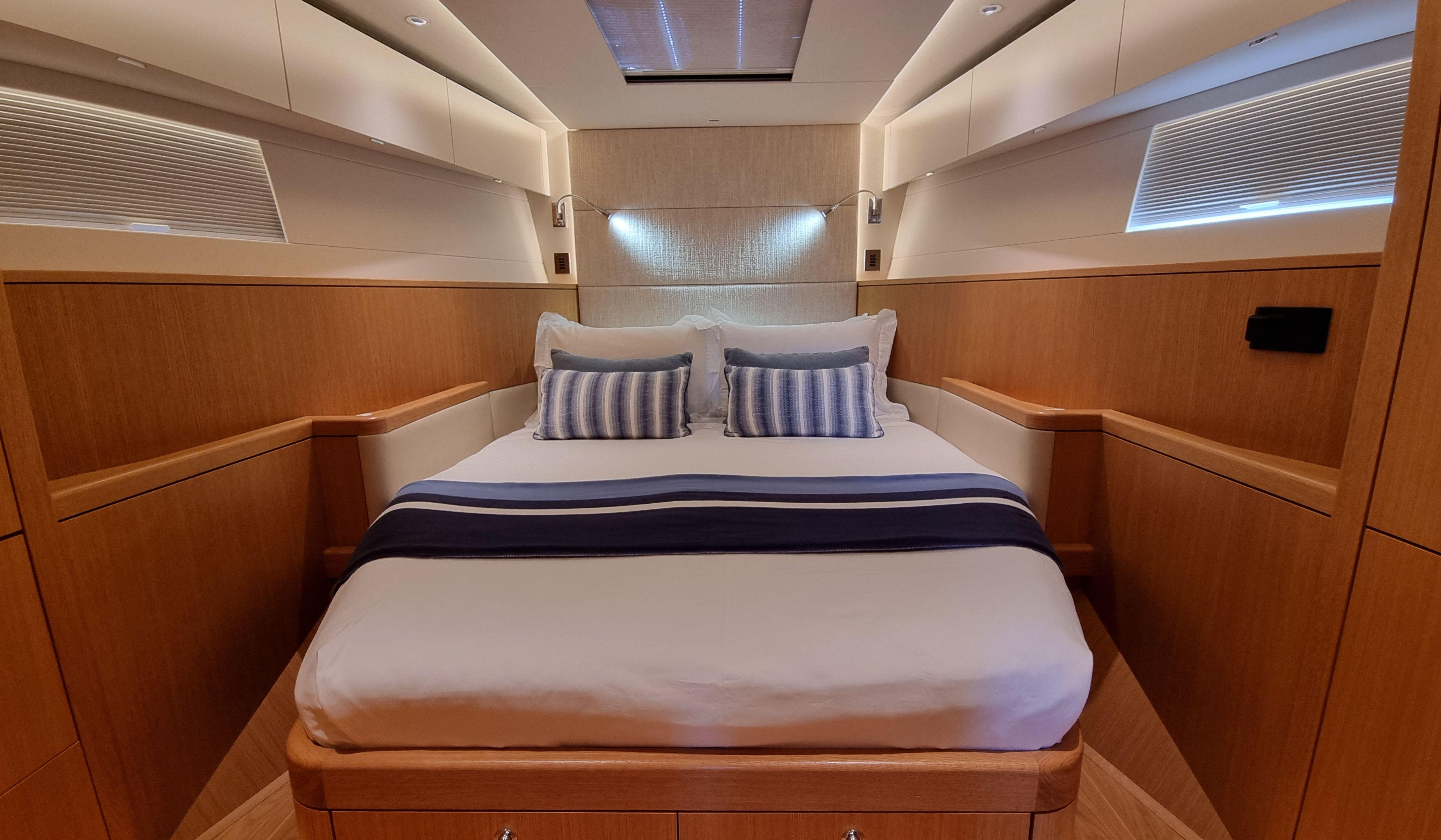 Boasting effortless sail handing thanks to her hydraulic in-mast furling, electric winches, and comprehensive sail wardrobe, JaZoFi is equally suited to serious offshore passages and easy for short-handed cruising. The deck layout is impressive, with teak finishes, a fold-down hydraulic bathing platform, and cleverly integrated features like recessed hatches, davits, and a spacious split cockpit for both guests and helming. Practical systems—like lithium-ion batteries, solar panels, a high-capacity watermaker, advanced B&G navigation electronics, and dual bow and stern thrusters —ensure self-sufficiency and reliability for long voyages.
