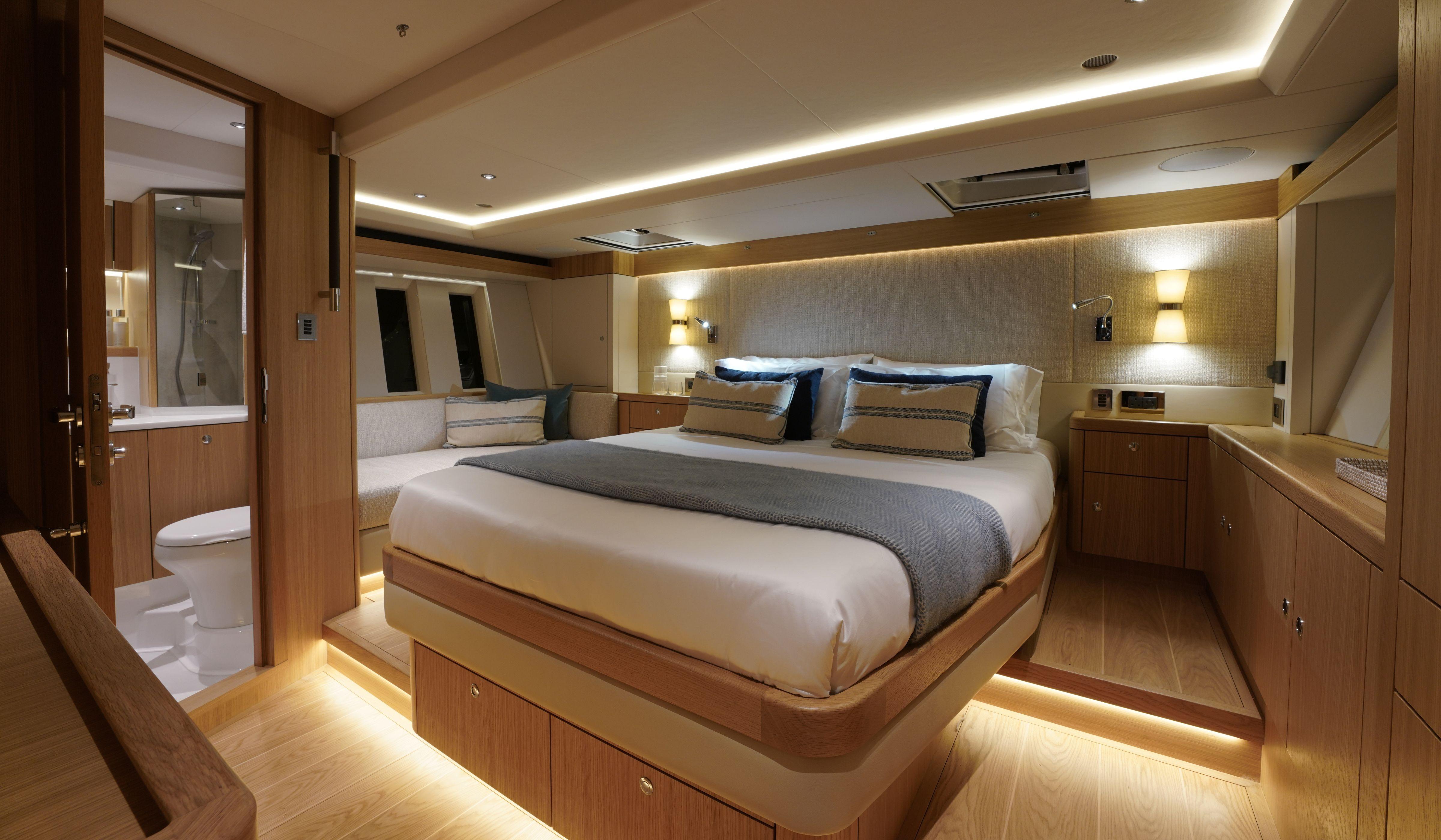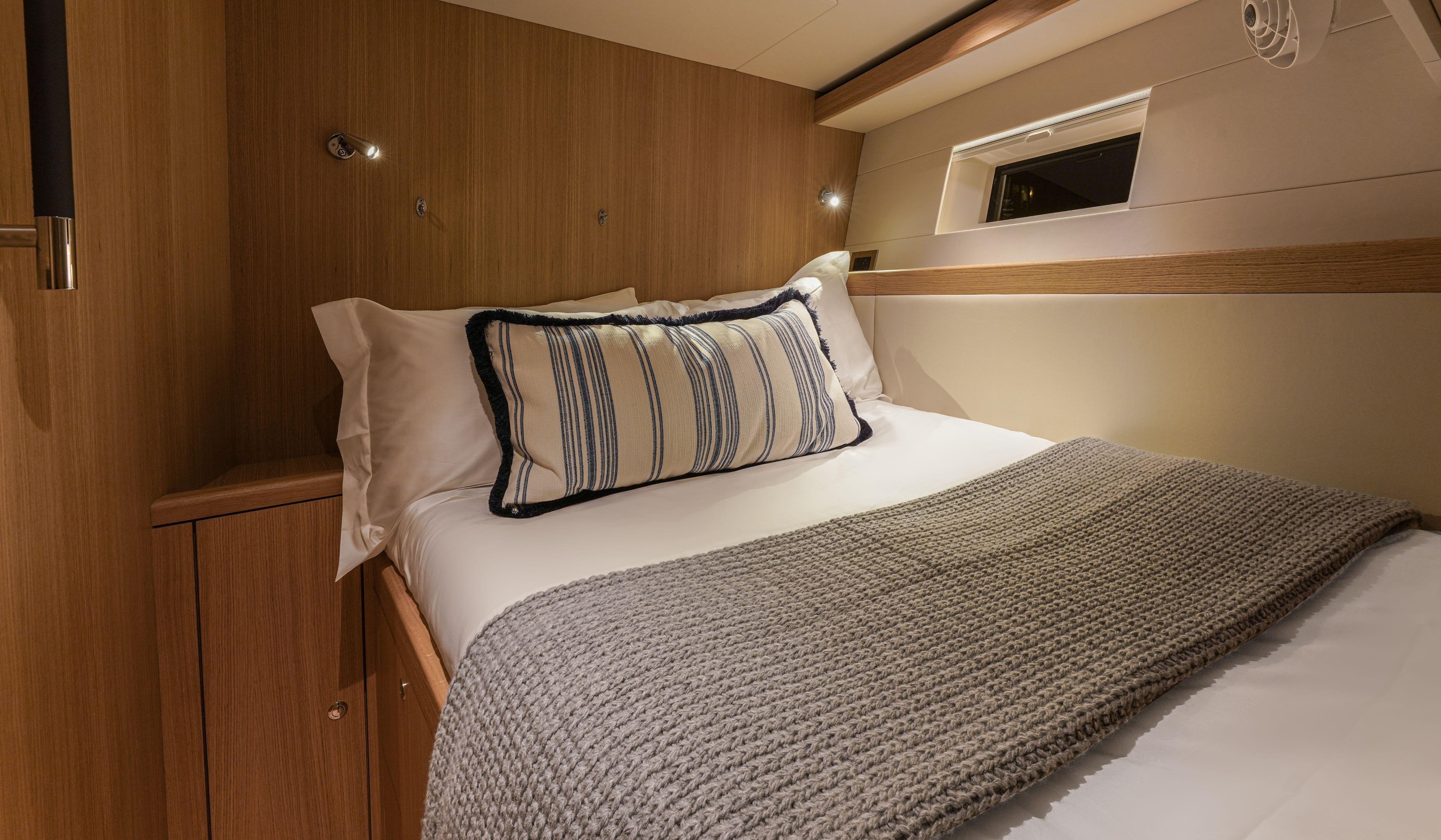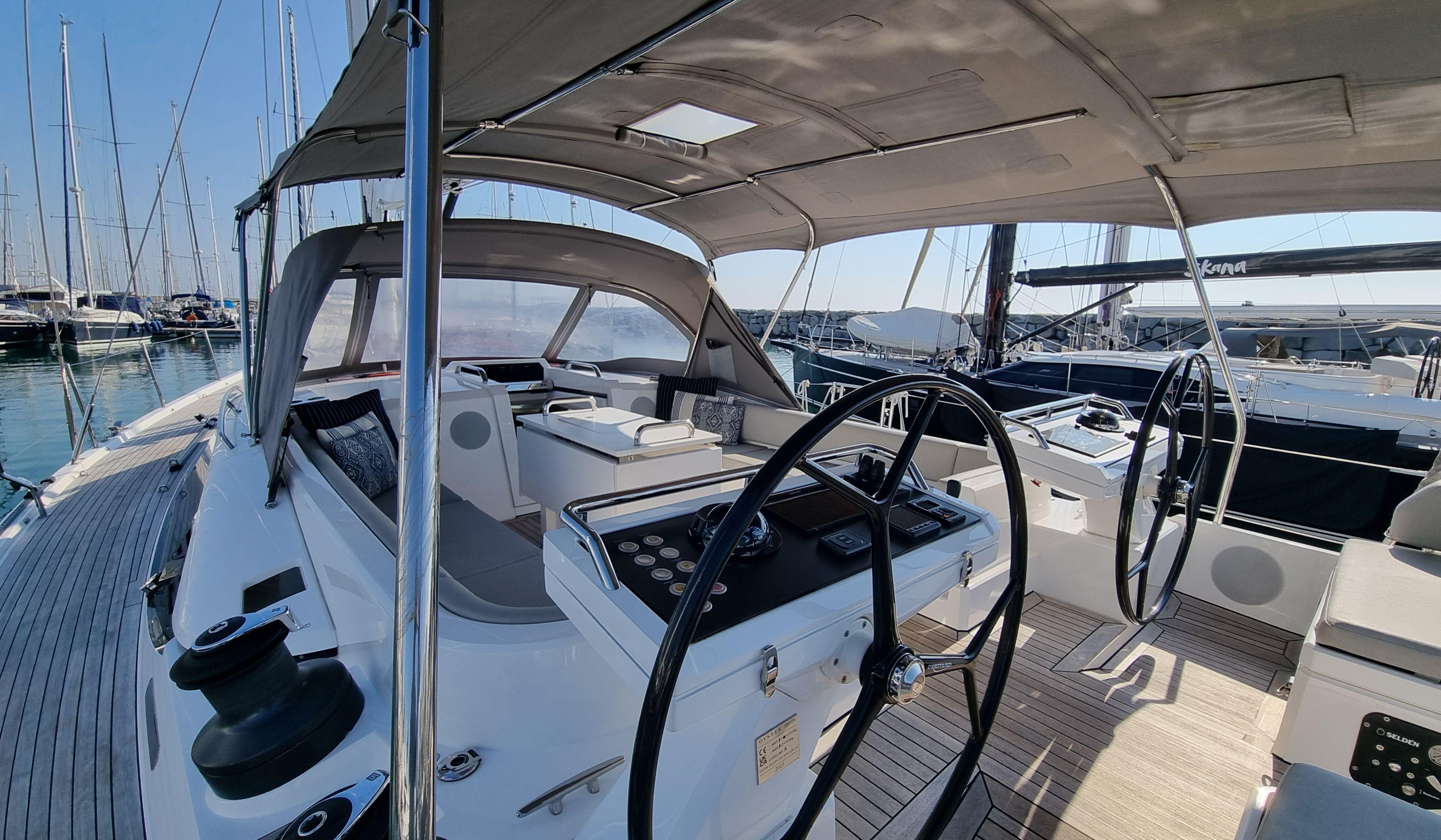 Boasting effortless sail handing thanks to her hydraulic in-mast furling, electric winches, and comprehensive sail wardrobe, JaZoFi is equally suited to serious offshore passages and easy for short-handed cruising. The deck layout is impressive, with teak finishes, a fold-down hydraulic bathing platform, and cleverly integrated features like recessed hatches, davits, and a spacious split cockpit for both guests and helming. Practical systems—like lithium-ion batteries, solar panels, a high-capacity watermaker, advanced B&G navigation electronics, and dual bow and stern thrusters —ensure self-sufficiency and reliability for long voyages.