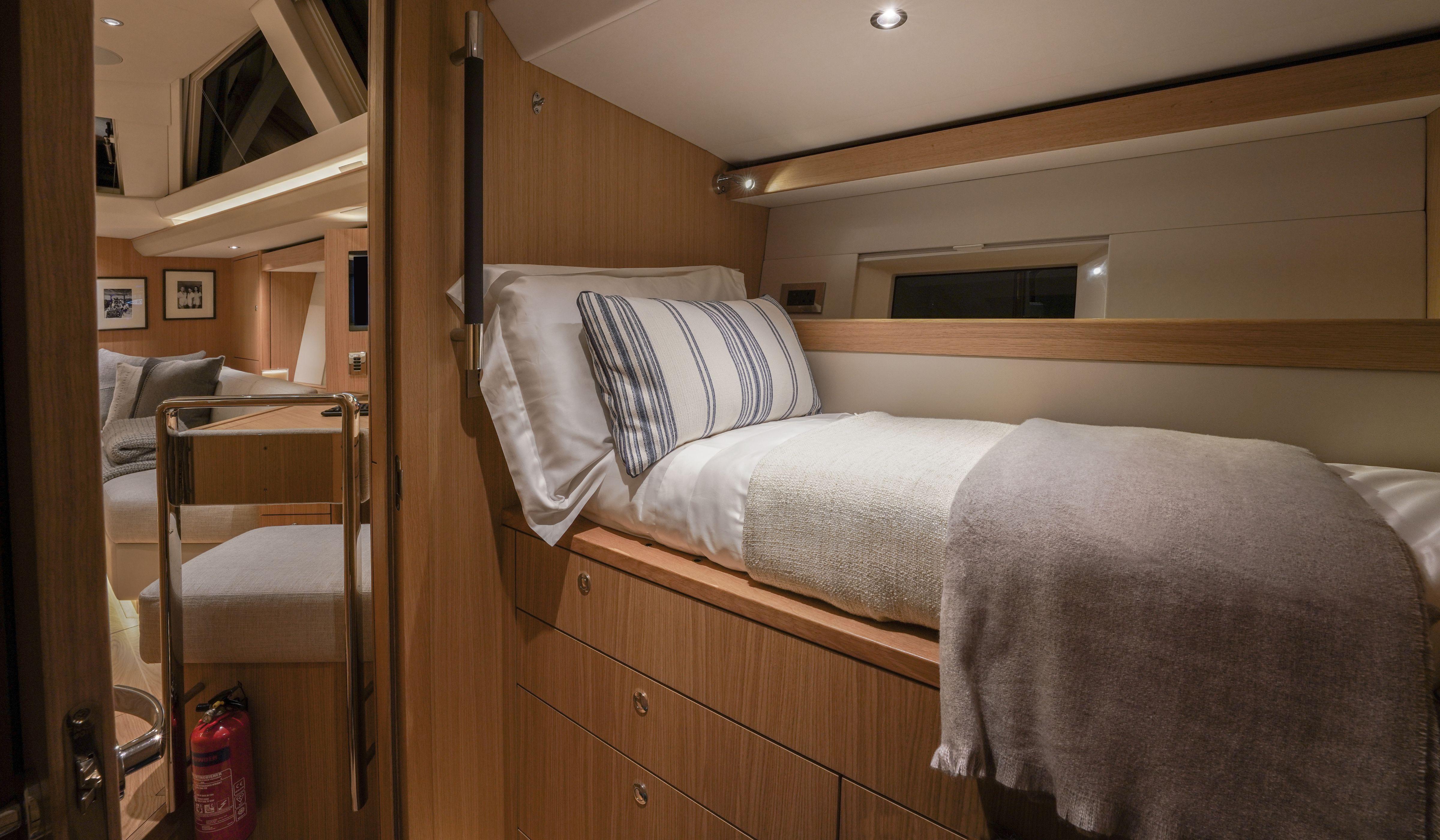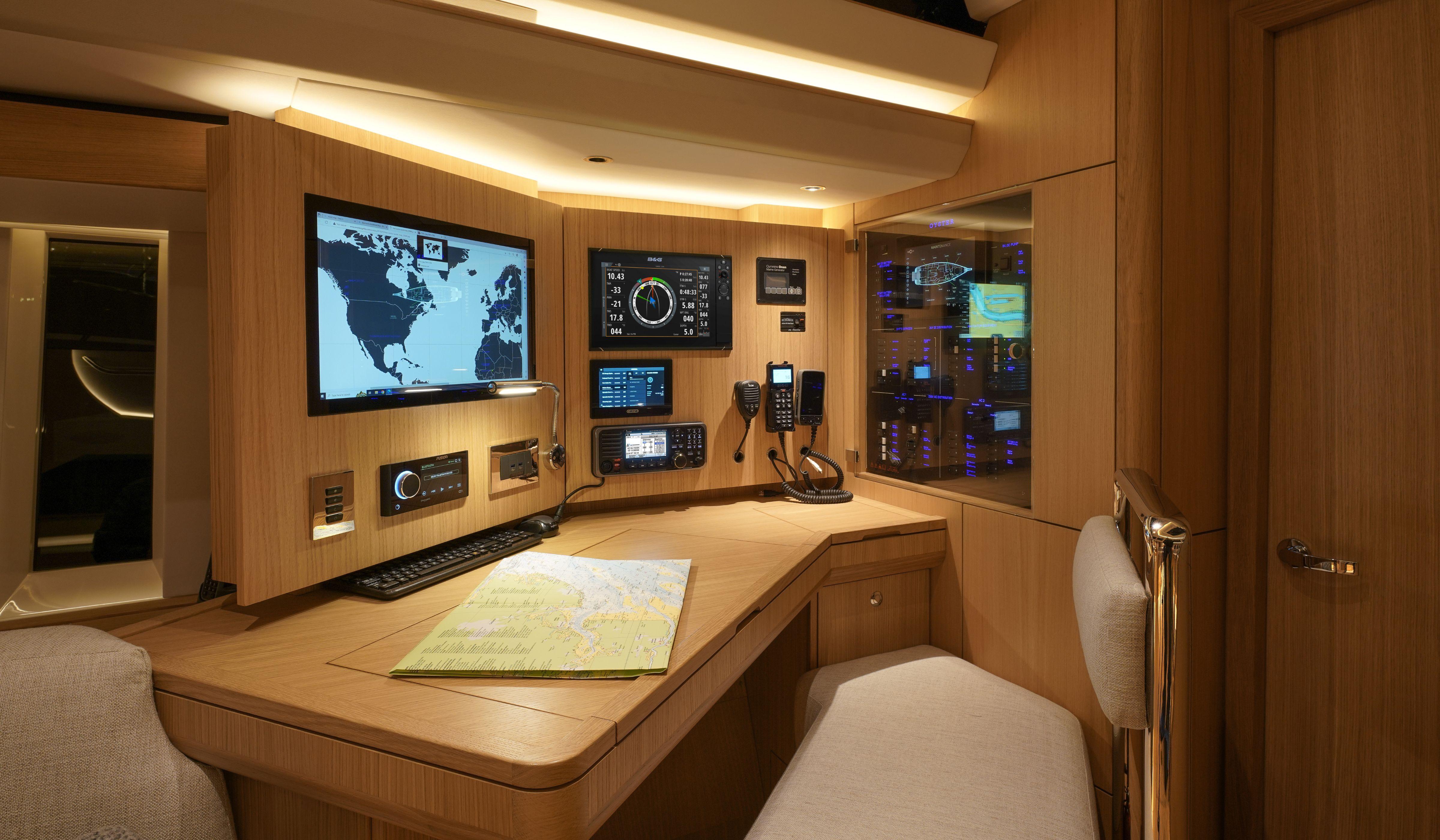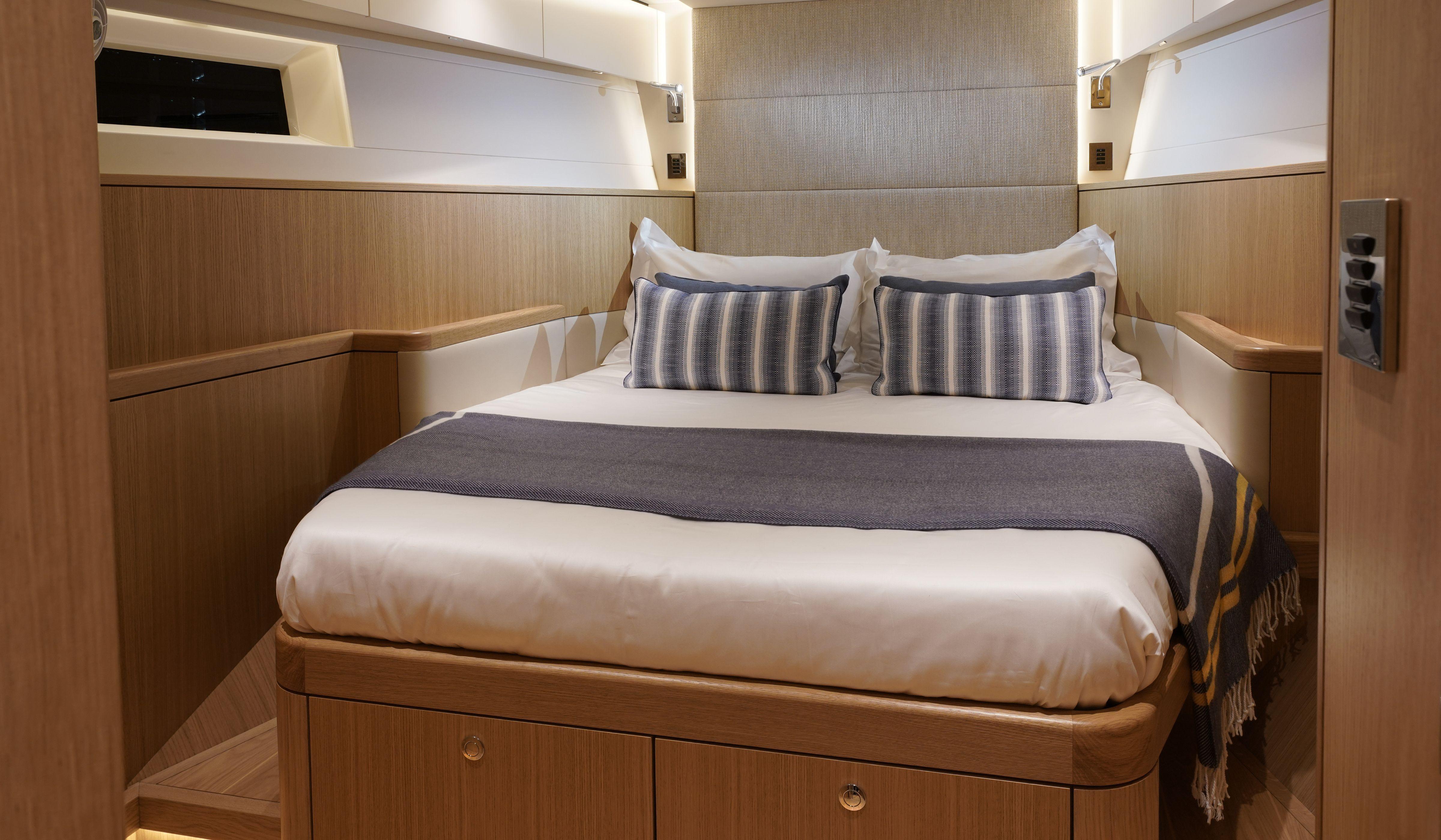 Below deck, JaZoFi offers true luxury with seven berths across four beautifully finished oak-lined cabins, including a sumptuous owner’s stateroom. The saloon is light-filled with seascape windows and adaptable dining, while the galley is equipped with premium appliances such as induction cooking, Quooker boiling water tap, dishwasher, and washer/dryer. Entertainment and connectivity are top-tier, with integrated Bowers & Wilkins audio, Apple TV, and Starlink internet.