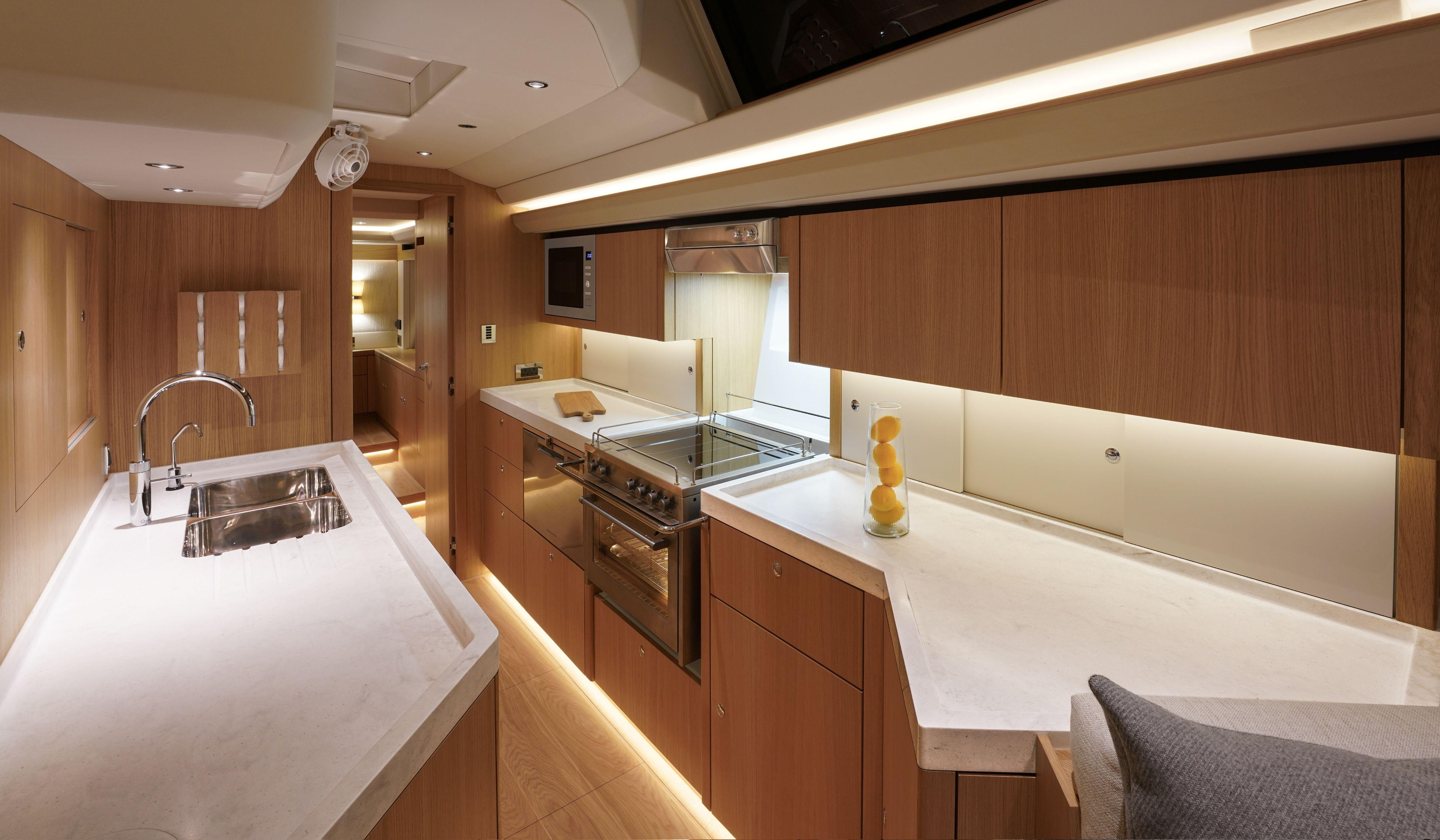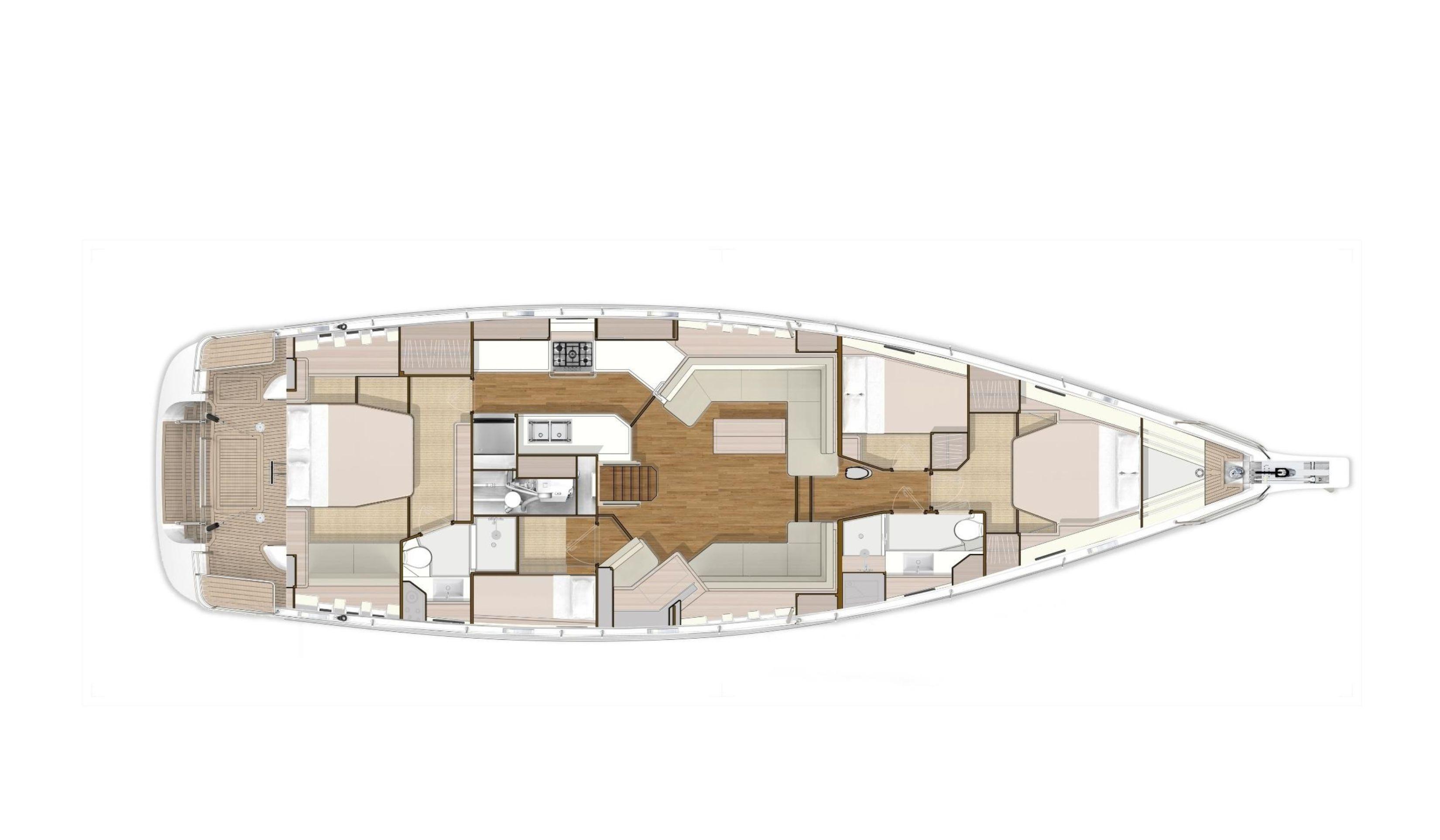 The Oyster 595 60-foot sailing yacht has our bluewater cruiser DNA running through her from bow to stern. Designed to be sailed shorthanded, with features like hydraulic push-button in-mast furling, she is also spacious enough for a professional crew. A centreboard option offers safe cruising in shallow waters, making her perfect for adventures anywhere on the world’s oceans. The Oyster 595 punches well above her weight, with superyacht-inspired technology and design features distilled from larger Oyster yachts. Below decks, there is a generous, open saloon with triple vertical seascape windows. The standard four-cabin layout has space for eight family and friends with an optional crew cabin and three heads for convenience. Designed and hand-crafted with Oyster’s renowned build quality and a large cockpit and protected helm positions. All this makes her a pleasure to sail, whether island-hopping in the Mediterranean or rounding the Cape.