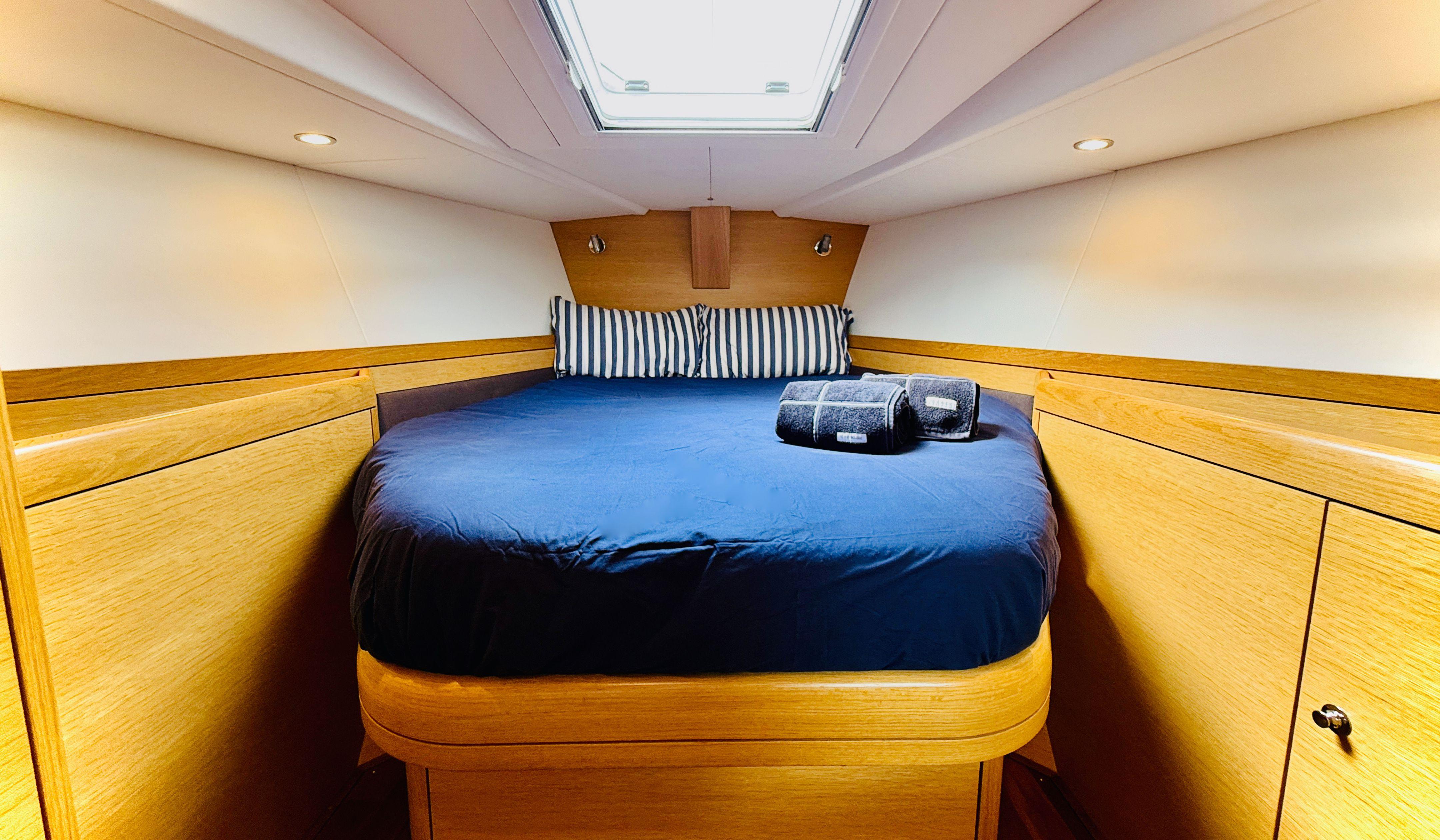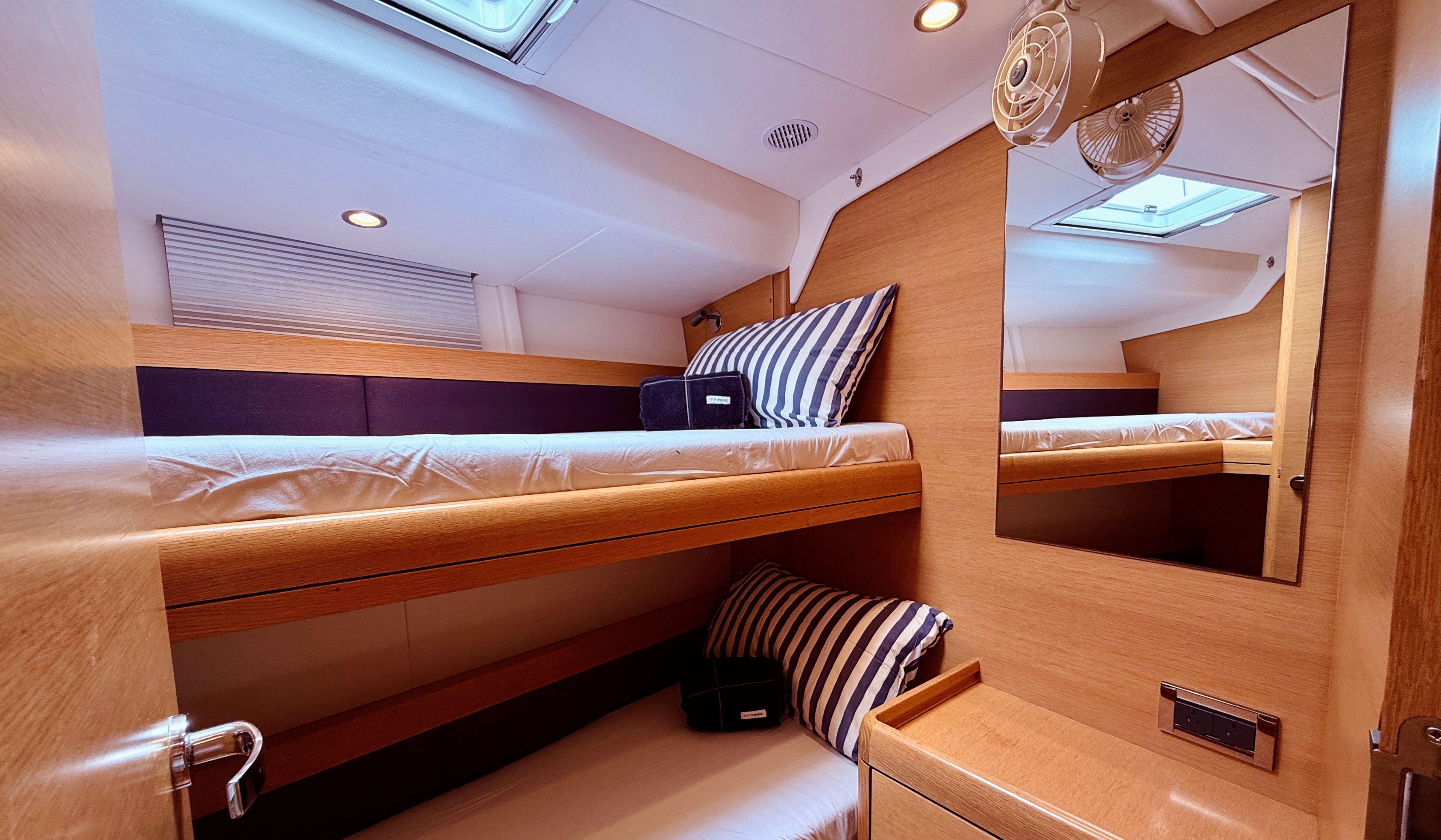 | CABINS | Six berths in three cabins |