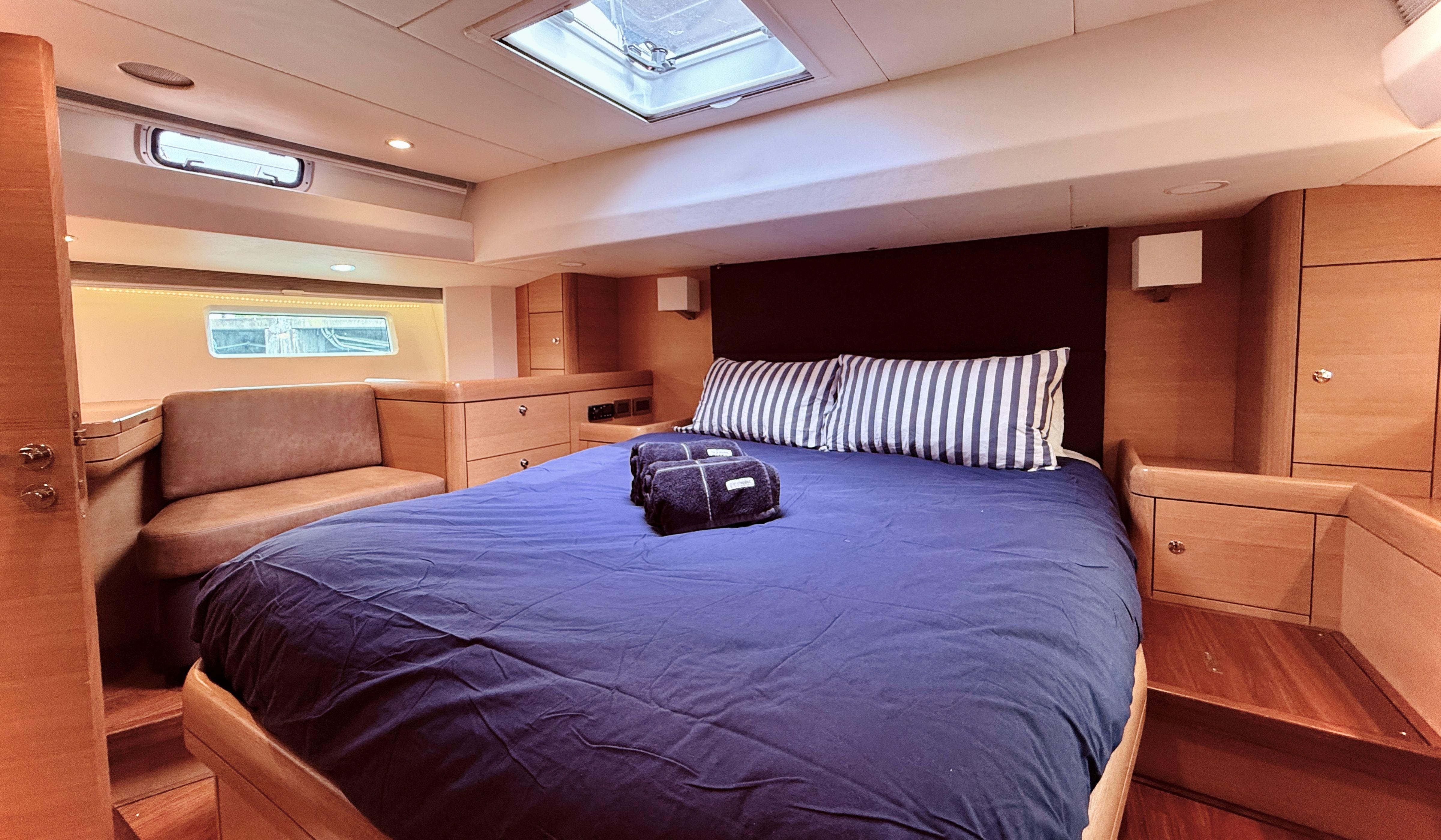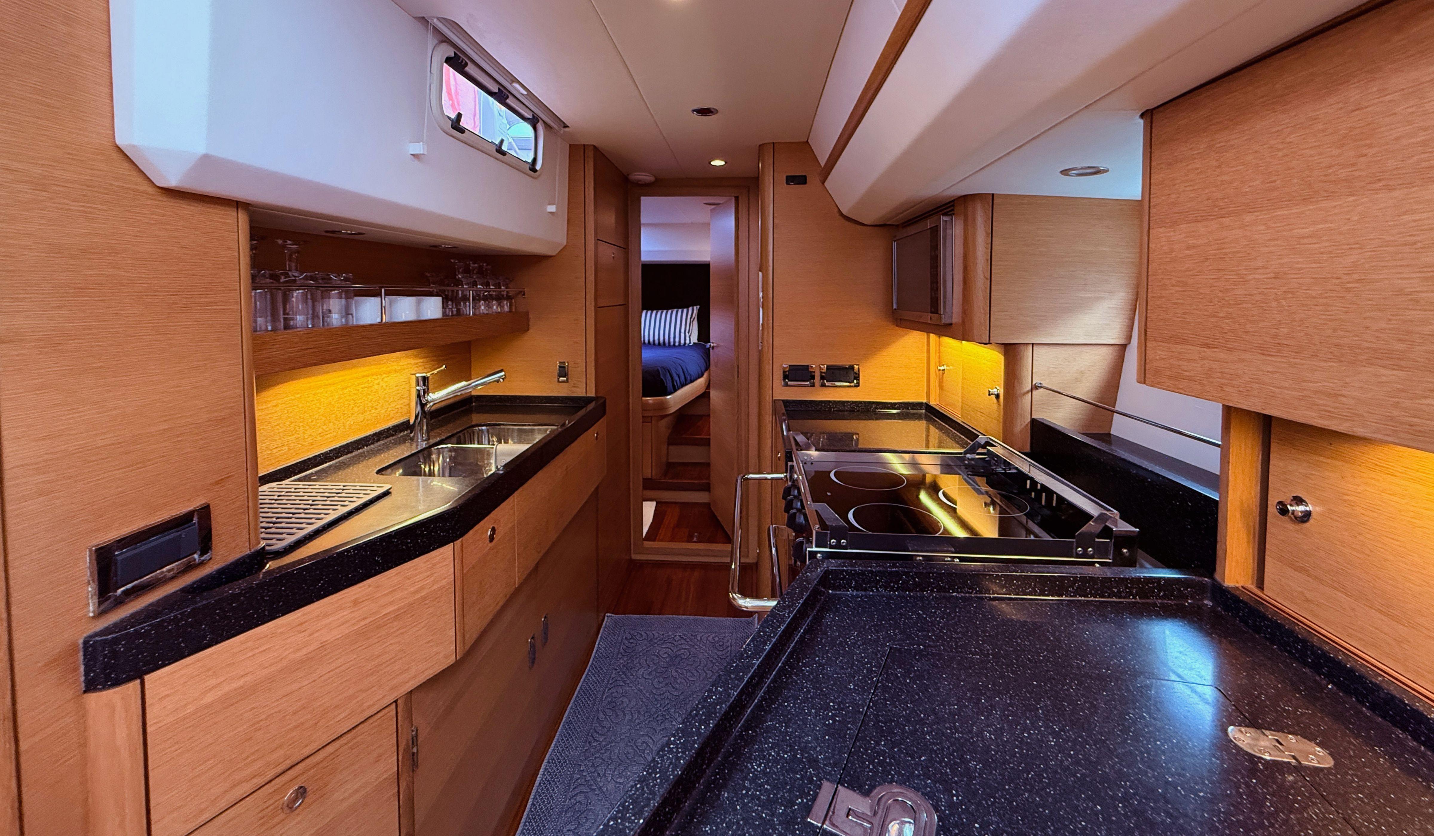 Inside, the three-cabin layout takes full advantage of the yacht’s long waterline, generous beam, and ample headroom, resulting in a bright, airy, and comfortable living space.