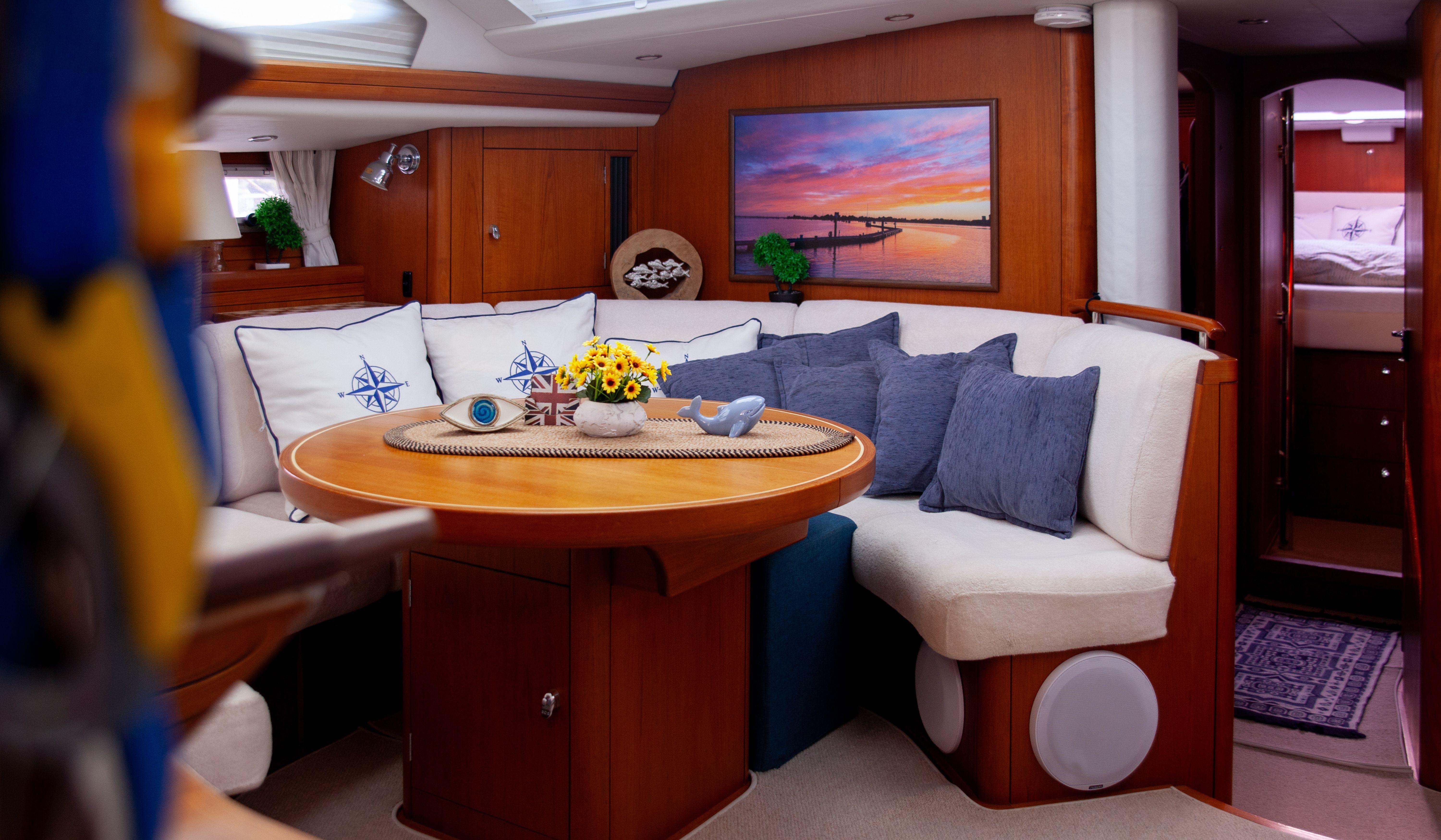 Her owners have invested in thoughtful upgrades that enhance comfort, style, and independence. These include a new bimini with integrated solar panels for sustainable energy, fresh Permateak decking to the foredeck for a modern and low-maintenance finish, and a complete new on-deck cushion set to ensure luxurious comfort while cruising or at anchor.