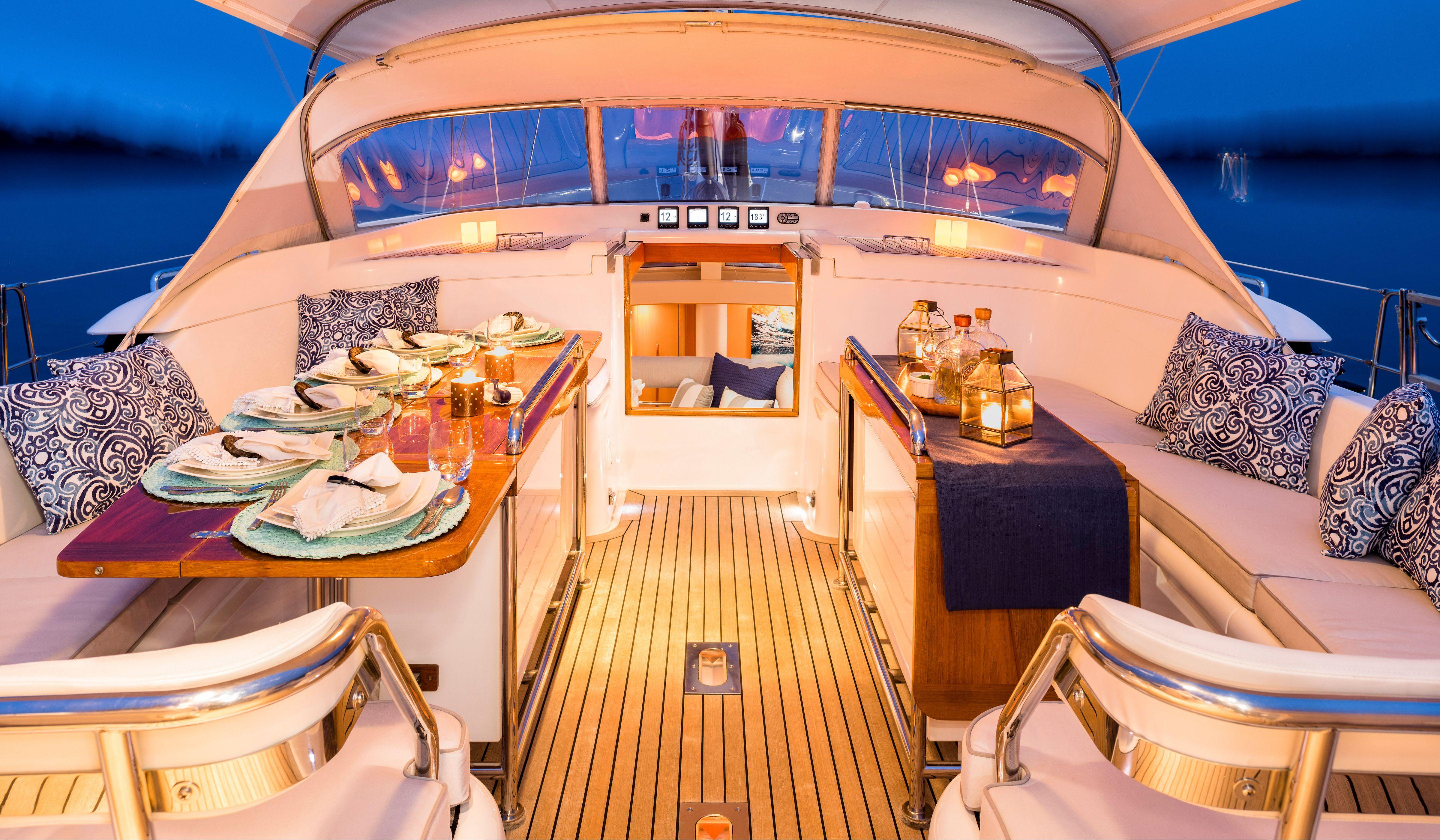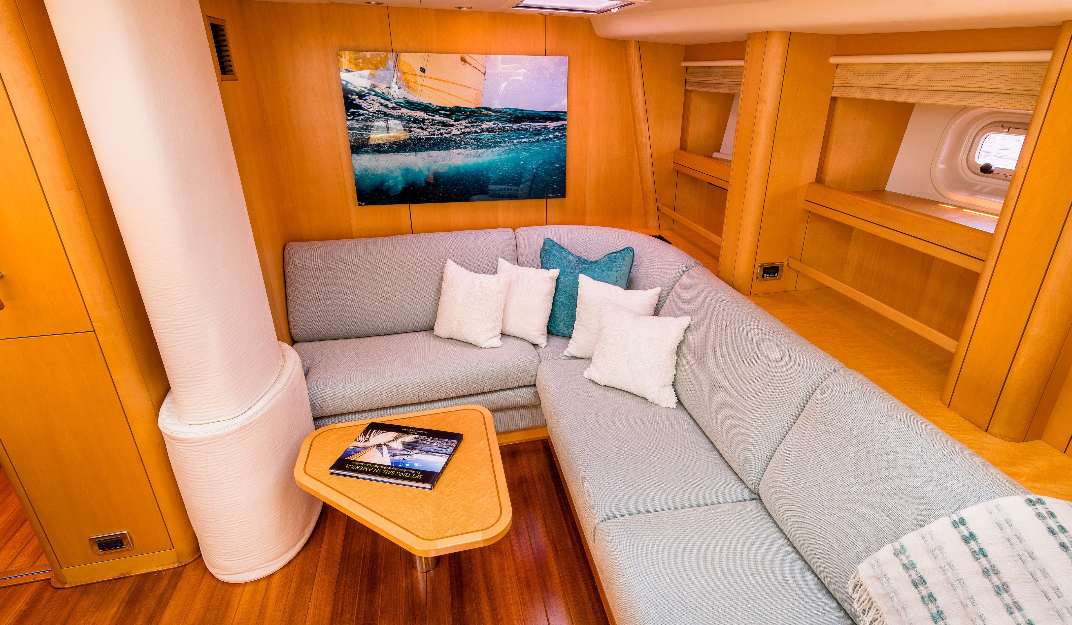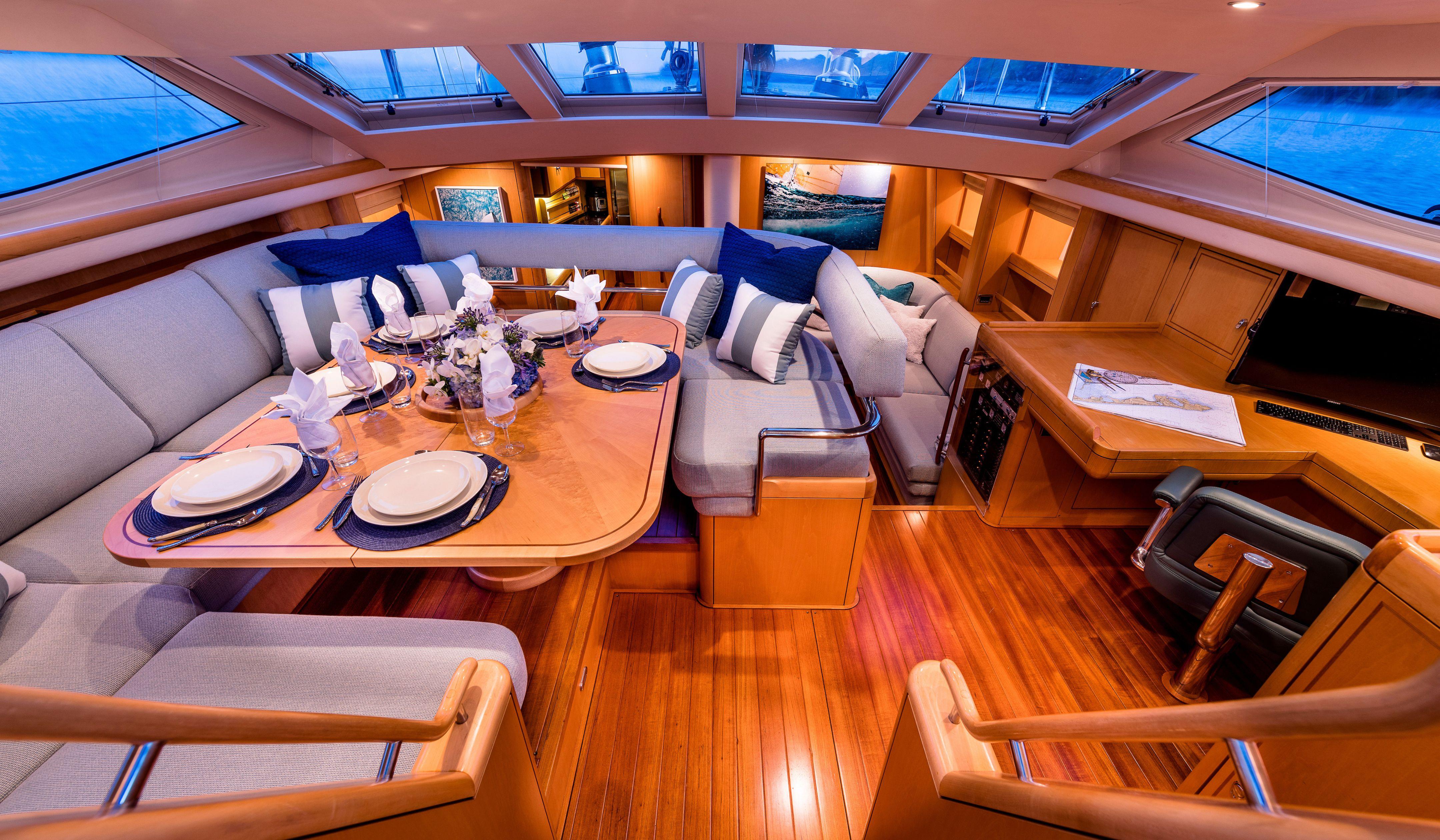 The upper saloon offers a direct line of sight outboard, providing a panoramic vista and direct access to the cockpit. The lower saloon typically incorporates seating and a movie system.
