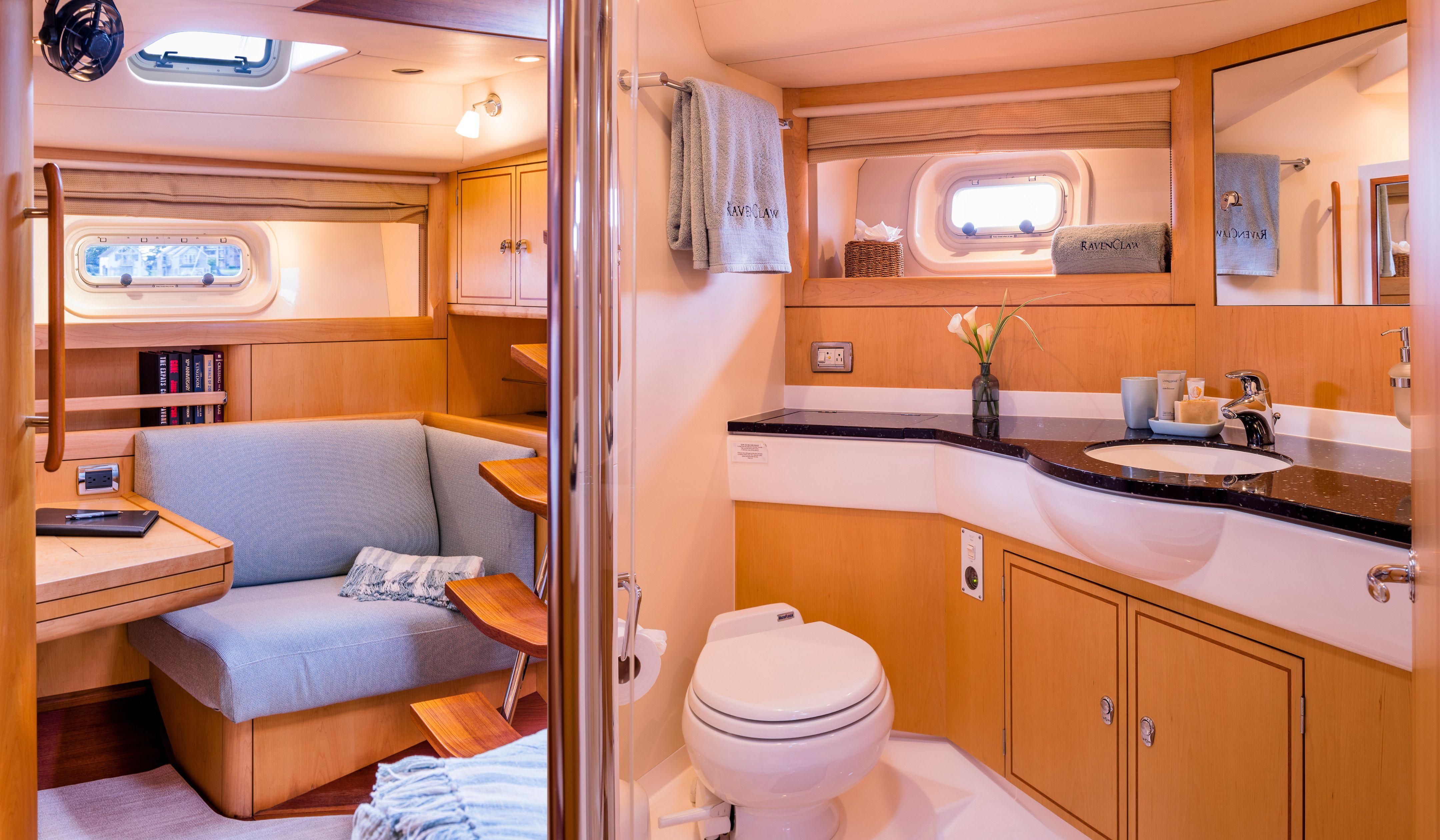 The Oyster 82 offers full standing headroom under the cockpit floor, with a centreline passageway leading aft to the owner’s stateroom and two guest cabins. This gives owners and their guests privacy from the galley and en suite crew accommodation which are forward of the saloon.