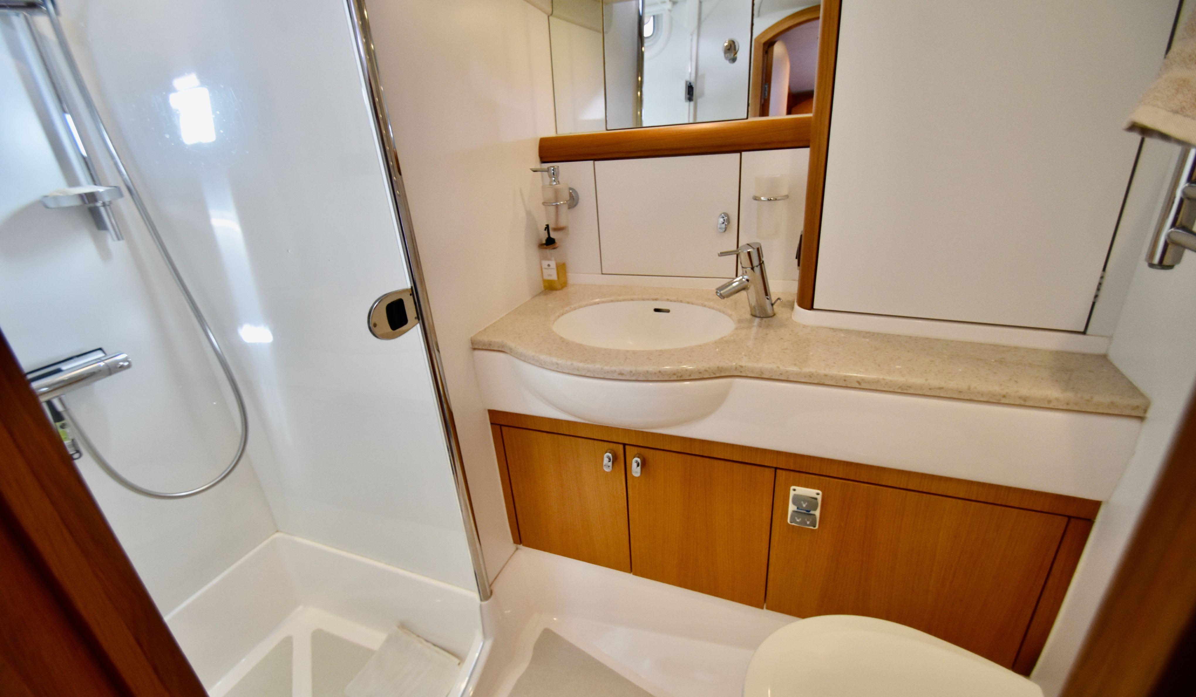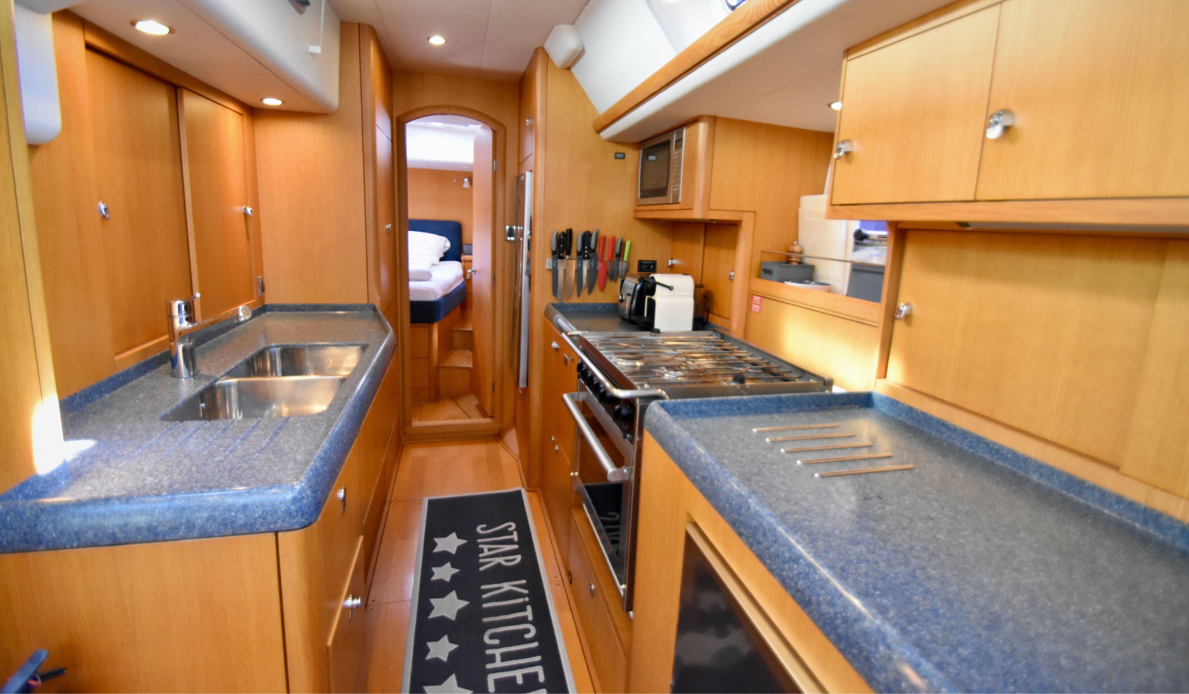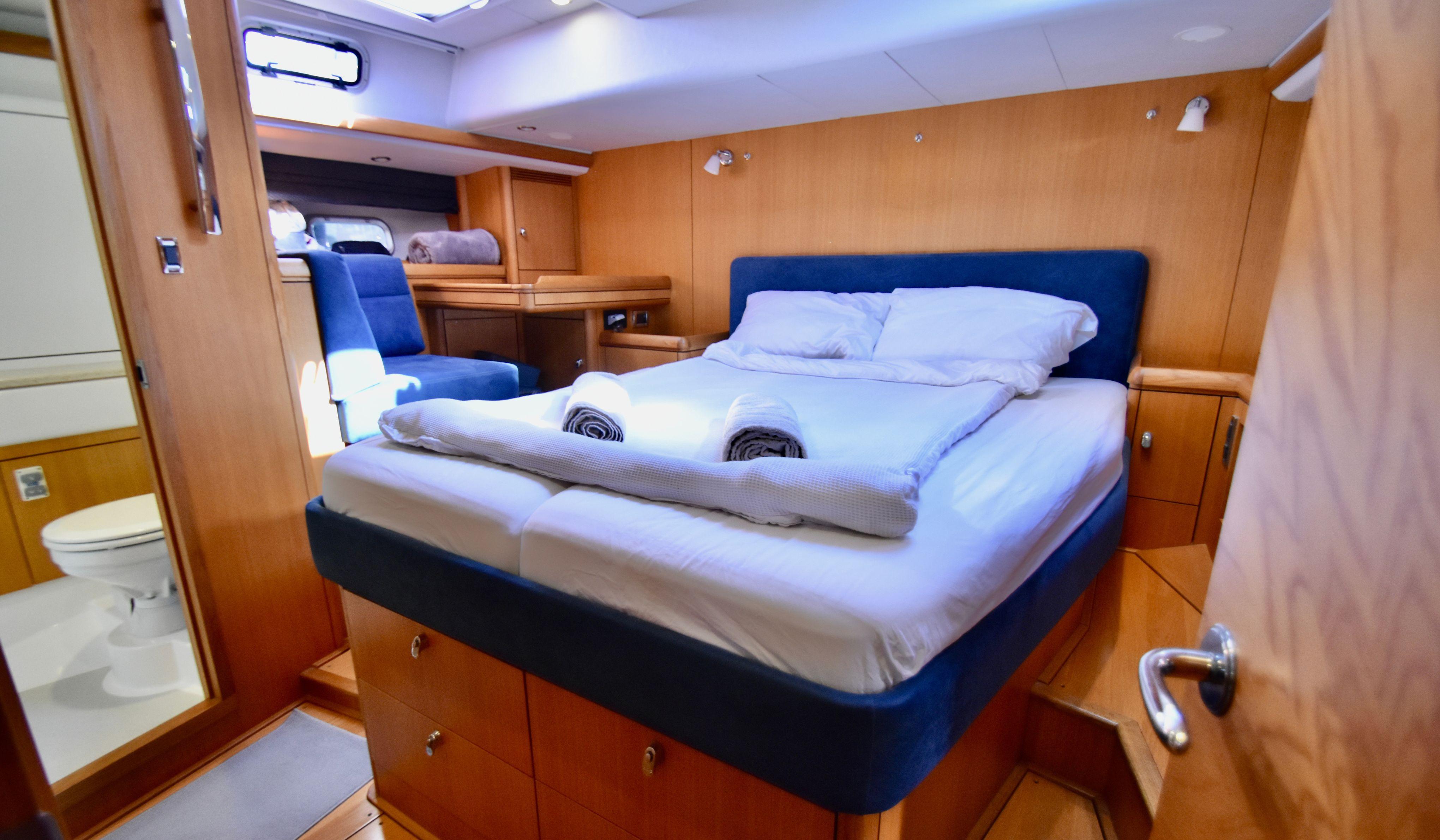 A beautifully crafted companionway staircase was also added to lead guests below decks, adding to the feeling of quality and security on this luxury sailboat, and the forward guest cabin was expanded with direct access to the forward head.